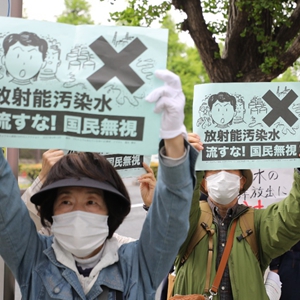2021年4月13日,抗议者在日本东京的首相官邸外反对福岛核污染水排入大海。新华社记者杜潇逸摄