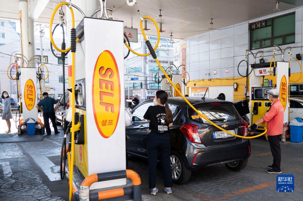 5月27日,市民在韩国首尔一家自助式加油站加油。
