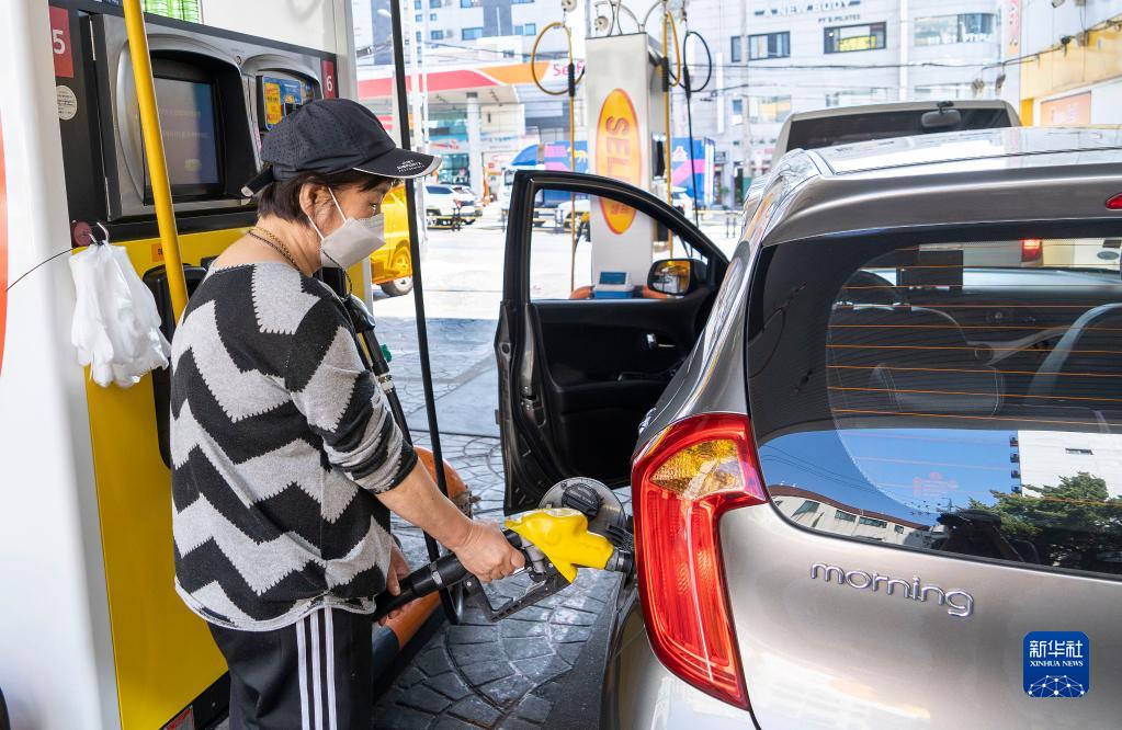 5月27日,市民在韩国首尔一家自助式加油站加油。