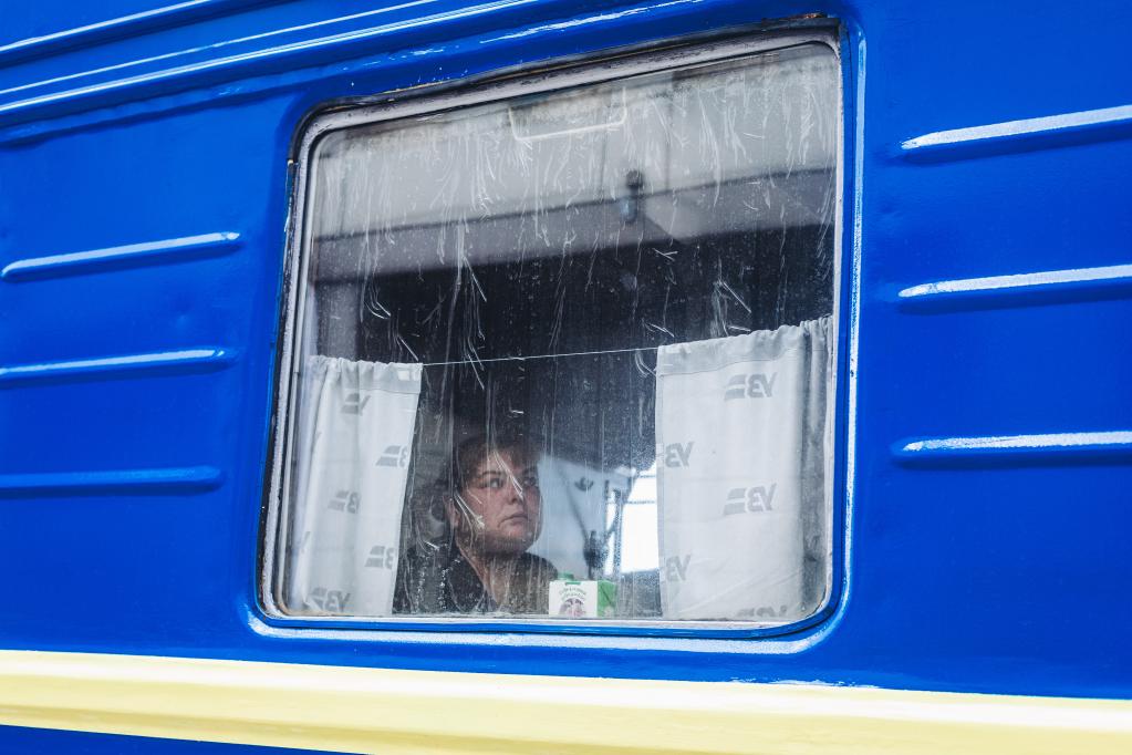 5月23日,在顿涅茨克的波克罗夫斯克,一名女子登上火车。新华社发(迭戈·埃雷拉摄)
