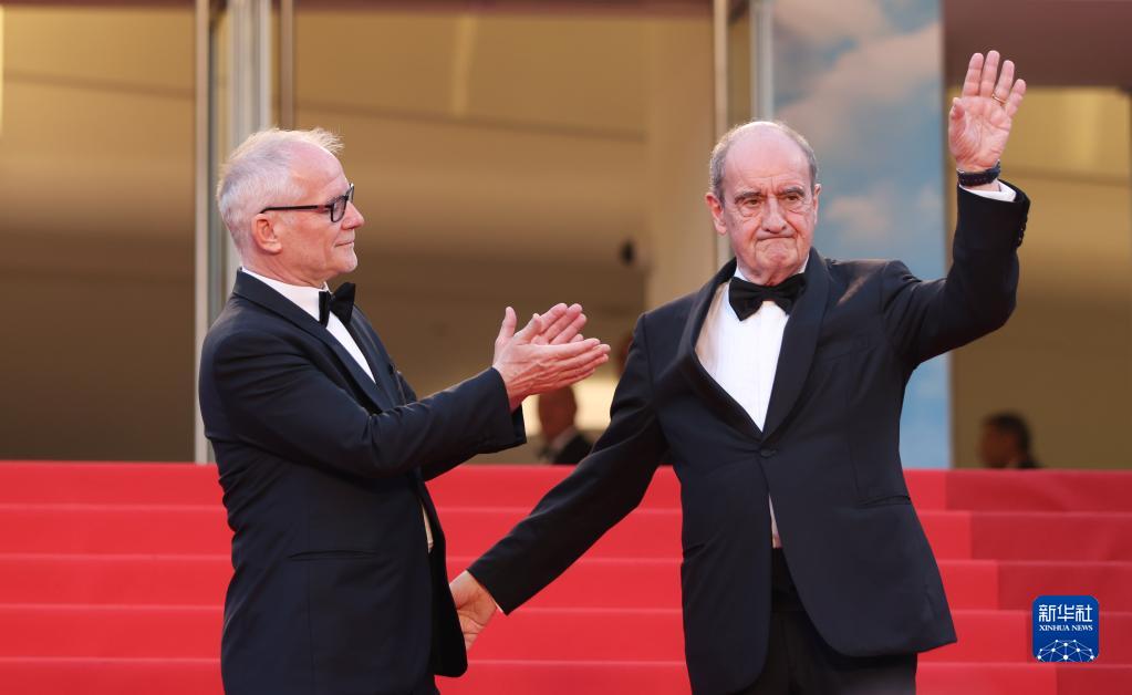 5月28日,在法国戛纳举行的第75届戛纳国际电影节上,戛纳电影节主席皮埃尔·莱斯屈尔(右)与戛纳电影节艺术总监蒂埃里·弗雷莫在闭幕式开始前向观众致意。