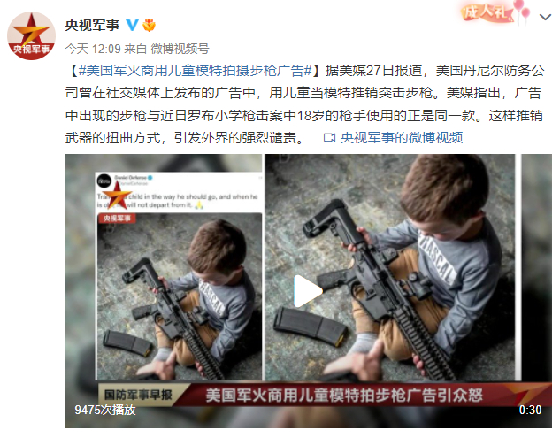 据美媒27日报道,美国丹尼尔防务公司曾在社交媒体上发布的广告中,用儿童当模特推销突击步枪。美媒指出,广告中出现的步枪与近日罗布小学枪击案中18岁的枪手使用的正是同一款。这样推销武器的扭曲方式,引发外界的强烈谴责。