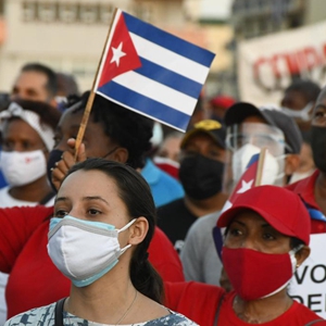 2021年7月17日,约10万民众在古巴首都哈瓦那参加爱国集会,抗议美国对古巴长期封锁、反对美国政府资助反古势力煽动骚乱。新华社发(华金·埃尔南德斯摄)