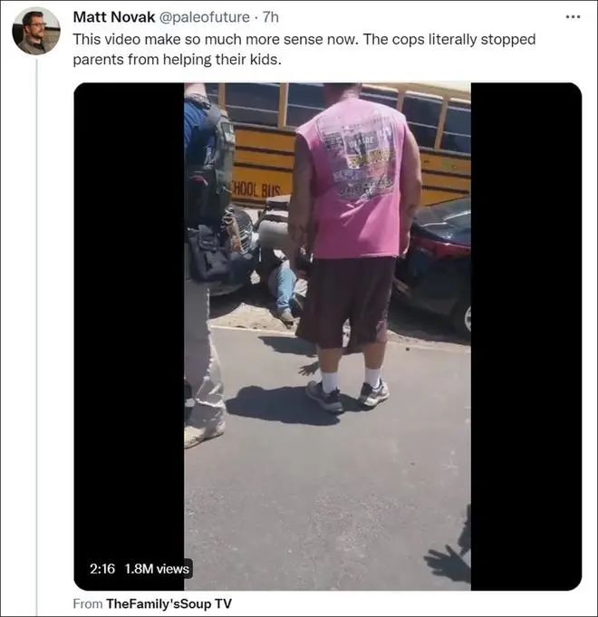值得一提的是,在看到美联社对卡萨雷斯的报道后,美国著名科技网站Gizmodo资深作家马特·诺瓦克,在推特上分享了一段视频,并写道:“这个视频现在更说得通了,警察们真的阻止父母帮助他们的孩子。”