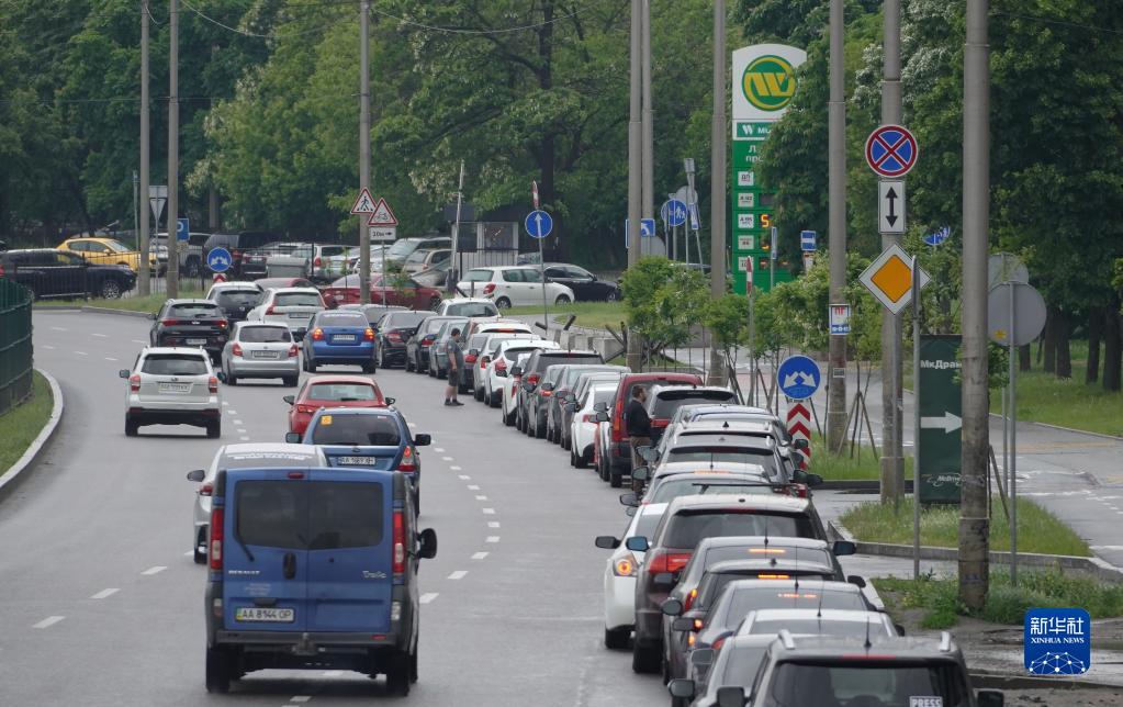 5月30日,在乌克兰基辅市中心一处加油站外,等待加油的车辆排起长龙。