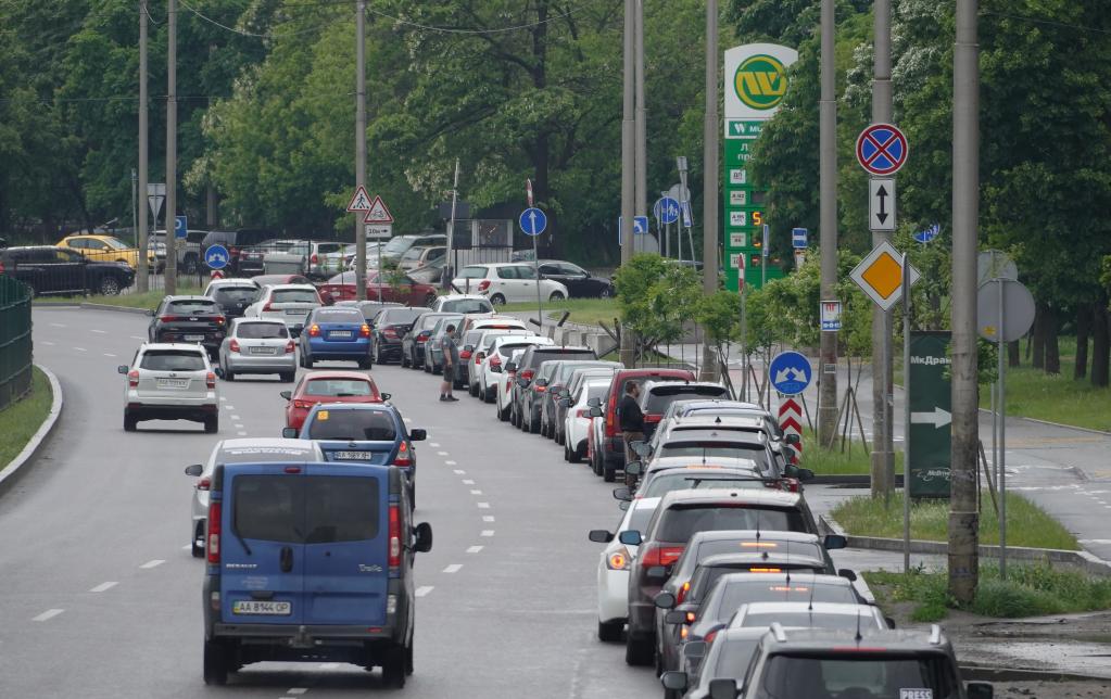5月30日,在乌克兰基辅市中心一处加油站外,等待加油的车辆排起长龙。新华社发(罗曼·佩图什科夫摄)