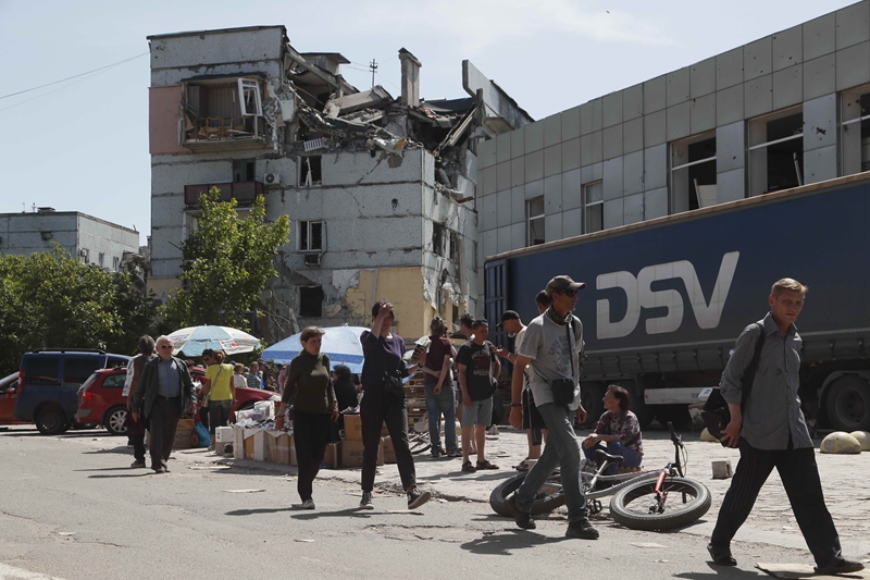 ↑5月30日,在马里乌波尔,人们从被损坏的建筑前走过。新华社发(维克托 摄)