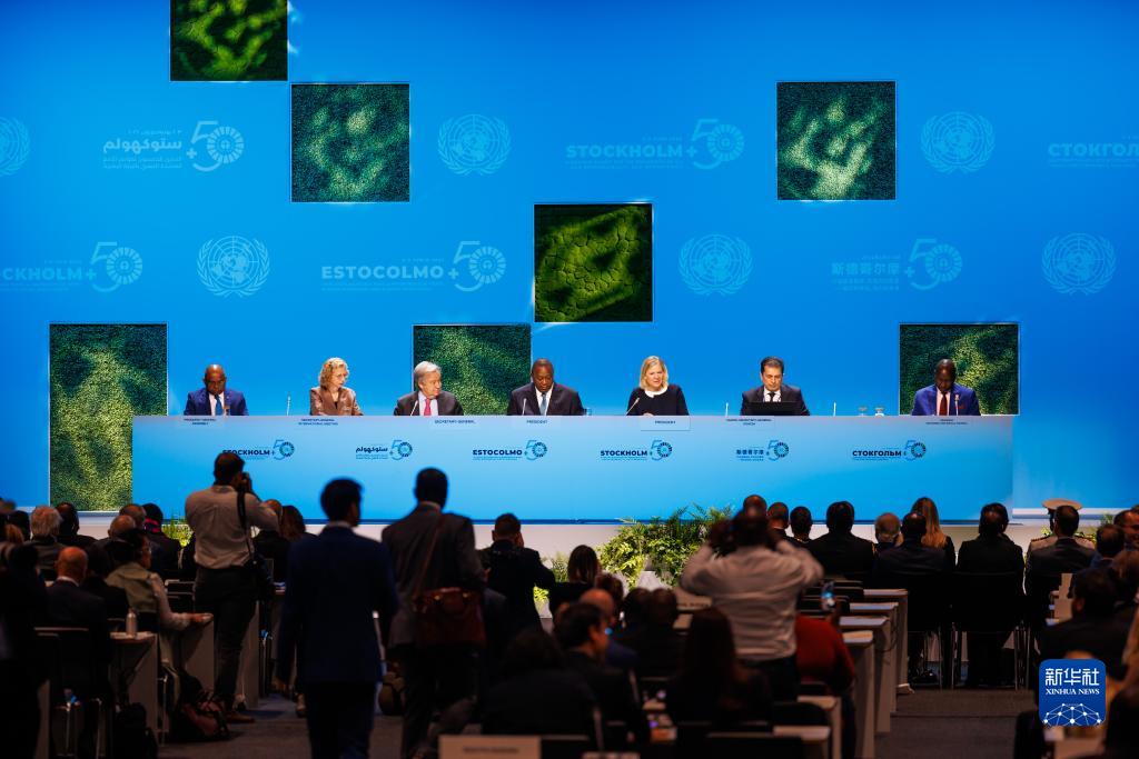 6月2日,联合国秘书长古特雷斯(左三)、瑞典首相安德松(左五)等在斯德哥尔摩出席“斯德哥尔摩+50”国际环境会议开幕式。