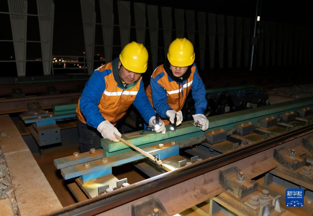 1月19日凌晨,昆明铁路局普洱基础设施段工务维修技术中心桥隧工施鹏彬(左)和同事孙顺良利用“天窗时间”,在中老铁路元江双线特大桥检修铁轨。