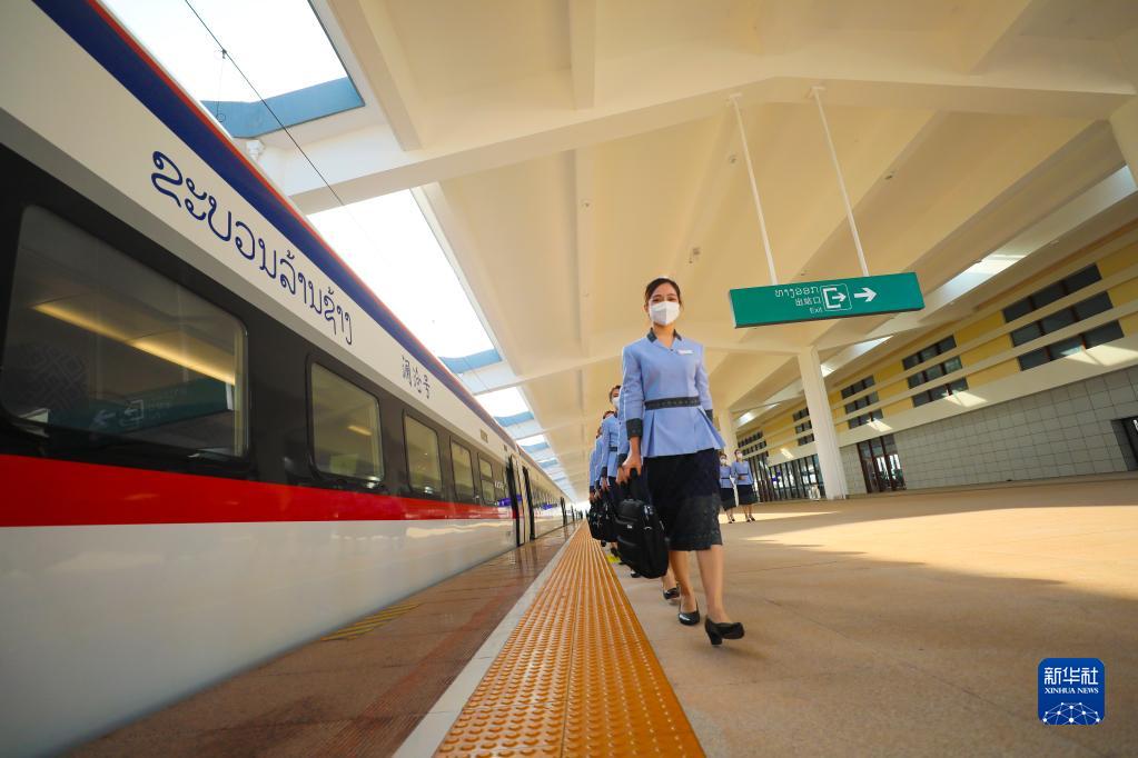 5月24日,在老挝中老铁路万象站,老中铁路有限公司的乘务员在“澜沧号”动车组外准备迎接乘客。