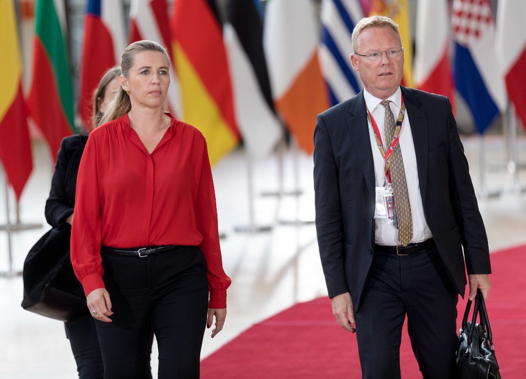 2019年7月2日,在位于比利时布鲁塞尔的欧盟总部,丹麦首相梅特·弗雷泽里克森(左)准备出席欧盟峰会。新华社发(莫纳斯摄)