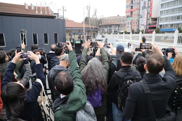 3月29日,媒体记者聚集在土耳其伊斯坦布尔的俄乌代表团谈判会场外。新华社发(于纳尔·恰姆摄)