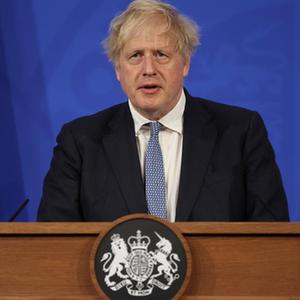 这是5月25日在伦敦拍摄的英国首相约翰逊出席新闻发布会的照片。