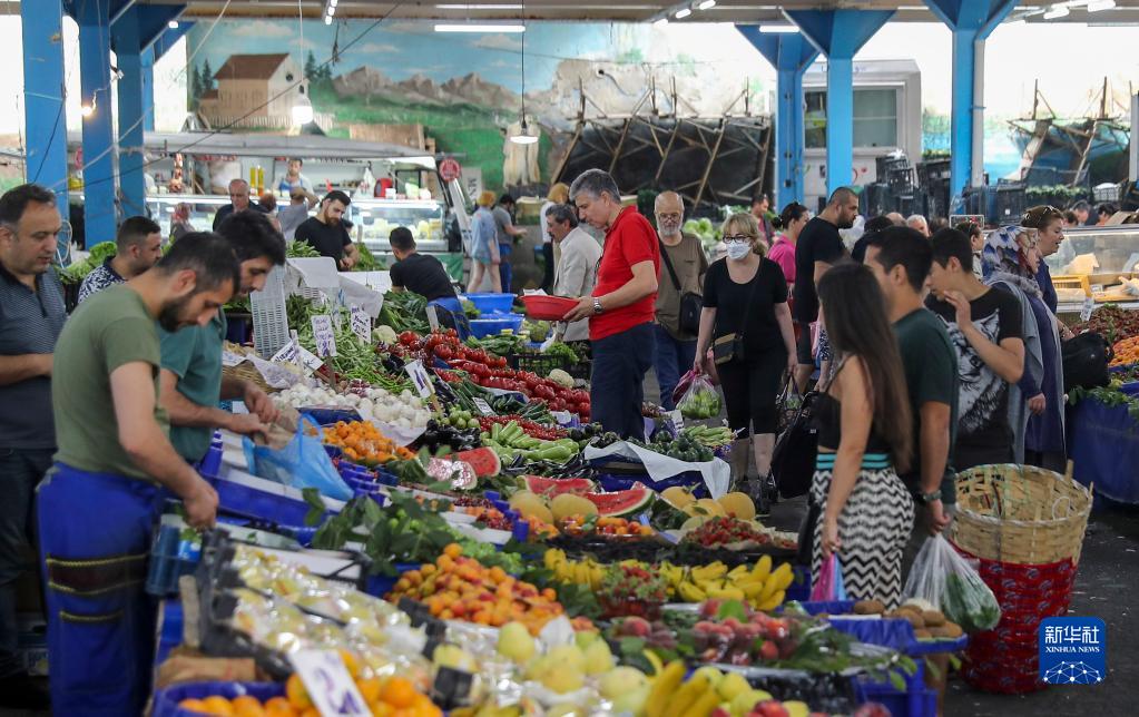 6月6日,顾客在土耳其伊斯坦布尔一处集市选购蔬菜。