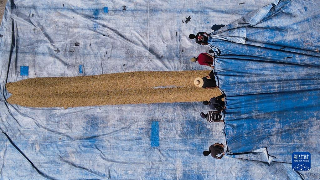 6月6日,在东帝汶埃尔梅拉,一家咖啡豆加工厂的工人在晒场上劳作(无人机照片)。 新华社记者 徐钦 摄