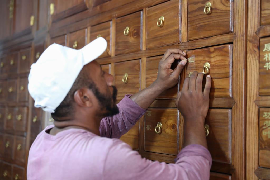 4月29日,中国-津巴布韦中医针灸中心负责人、中国援津医疗队队长朱伟在津巴布韦布拉瓦约的津巴布韦国际贸易博览会中医药展台工作。新华社发(肖恩·朱萨摄)