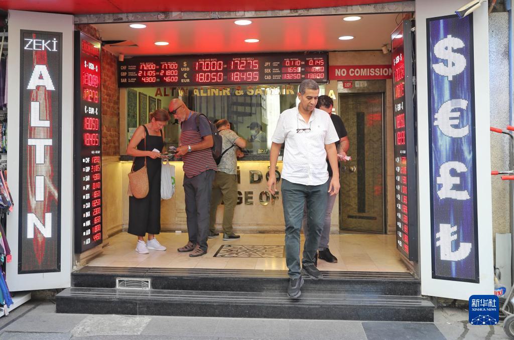 6月9日,在土耳其伊斯坦布尔,人们来到一处货币兑换点办理业务。