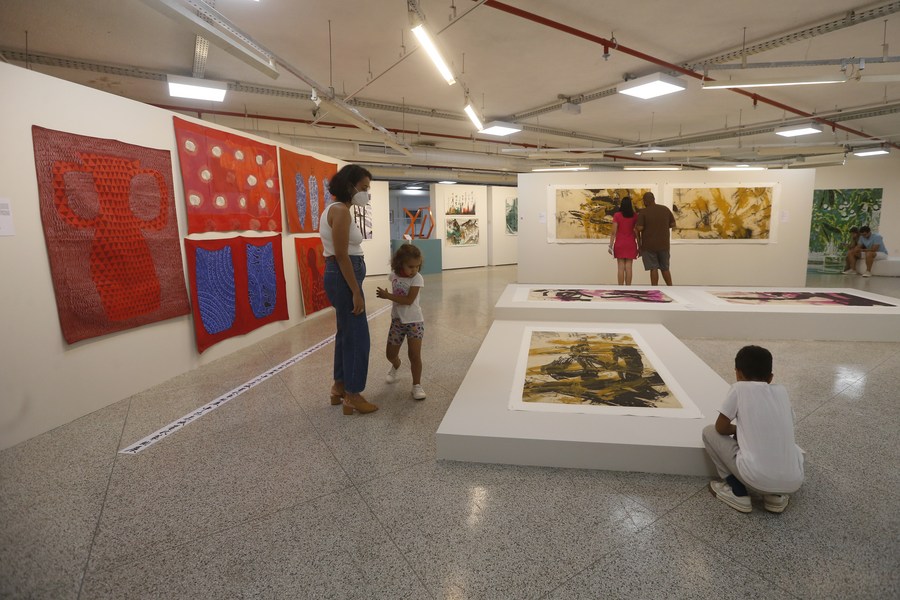 2022年3月26日,人们在巴西首都巴西利亚艺术博物馆参观“长城背后:中国巴西当代艺术展”。共有来自中国和巴西多位艺术家的70多件作品参展。新华社发(卢西奥·塔沃拉摄)