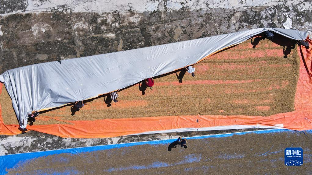 6月6日,工人们在东帝汶埃尔梅拉一家咖啡厂的晒场上劳作(无人机照片)。 新华社记者 徐钦 摄