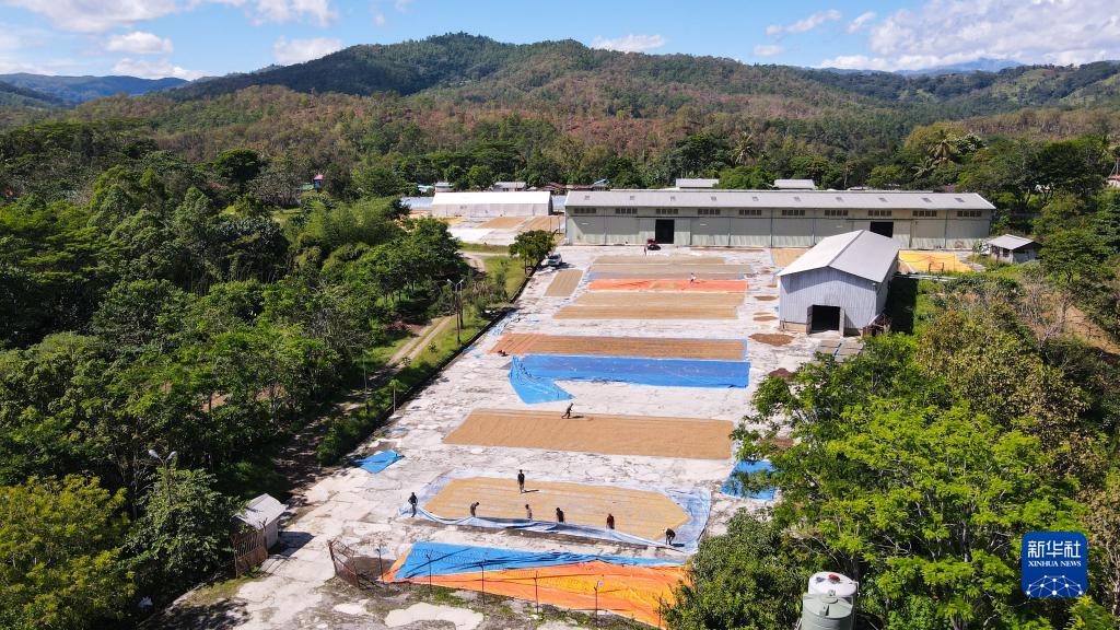6月6日,在东帝汶埃尔梅拉一家咖啡厂的晒场上,工人们在劳作(无人机照片)。 新华社记者 徐钦 摄