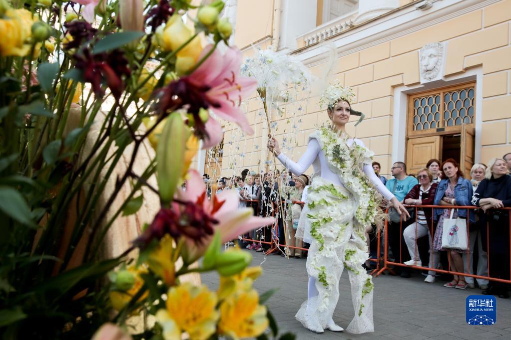 6月9日,模特在俄罗斯圣彼得堡街头展示鲜花装饰。