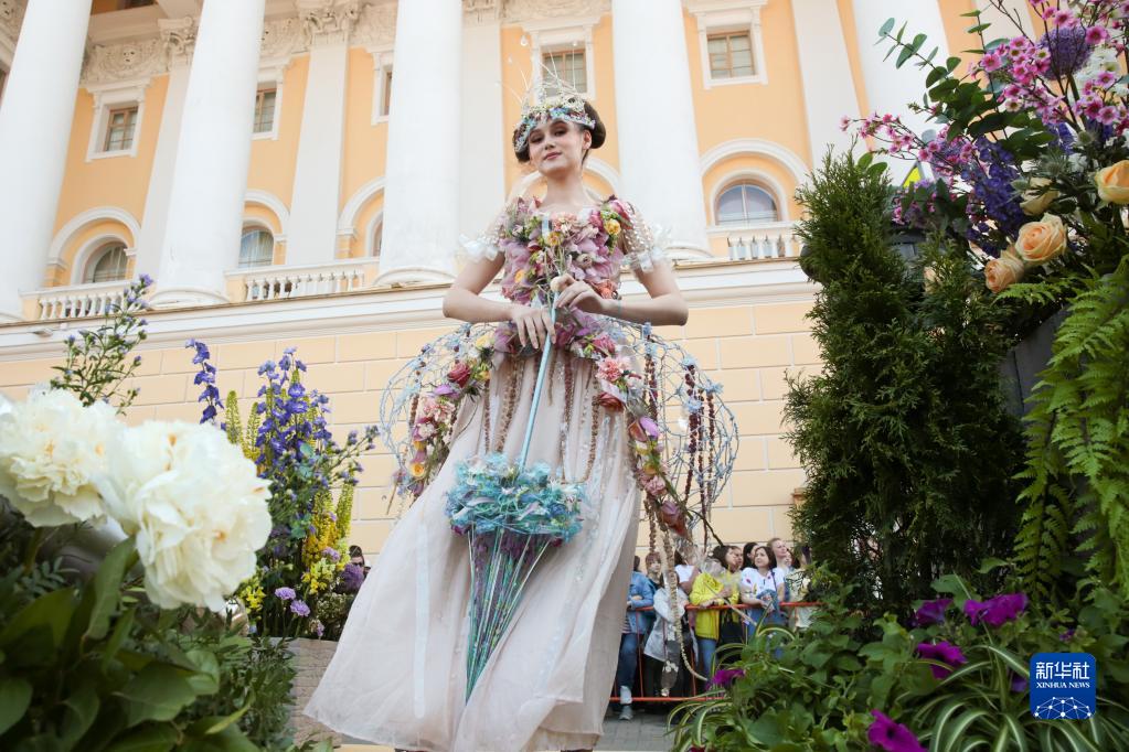 6月9日,模特在俄罗斯圣彼得堡街头展示鲜花装饰。