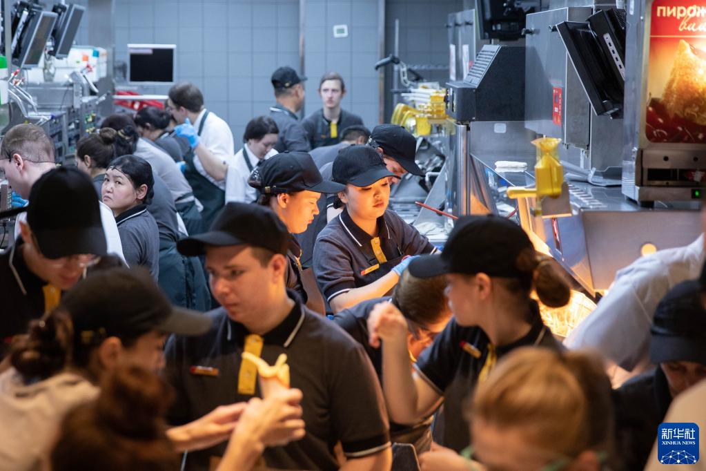 6月12日,工作人员在俄罗斯首都莫斯科普希金广场的“只有美味”连锁餐厅忙碌。