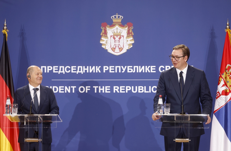 ↑6月10日,塞尔维亚总统武契奇(右)在首都贝尔格莱德与到访的德国总理朔尔茨出席新闻发布会。新华社发(普雷德拉格·米洛萨夫列维奇摄)