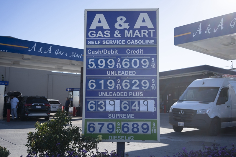 ↑这是6月11日在美国加利福尼亚州伯灵格姆拍摄的一家加油站的油价牌。据外媒报道,美国汽车协会11日的统计数据显示,当日美国全国普通汽油平均价格升至每加仑5.004美元。这也是美国历史上普通汽油平均价格首次突破每加仑5美元。 新华社发(李建国 摄)