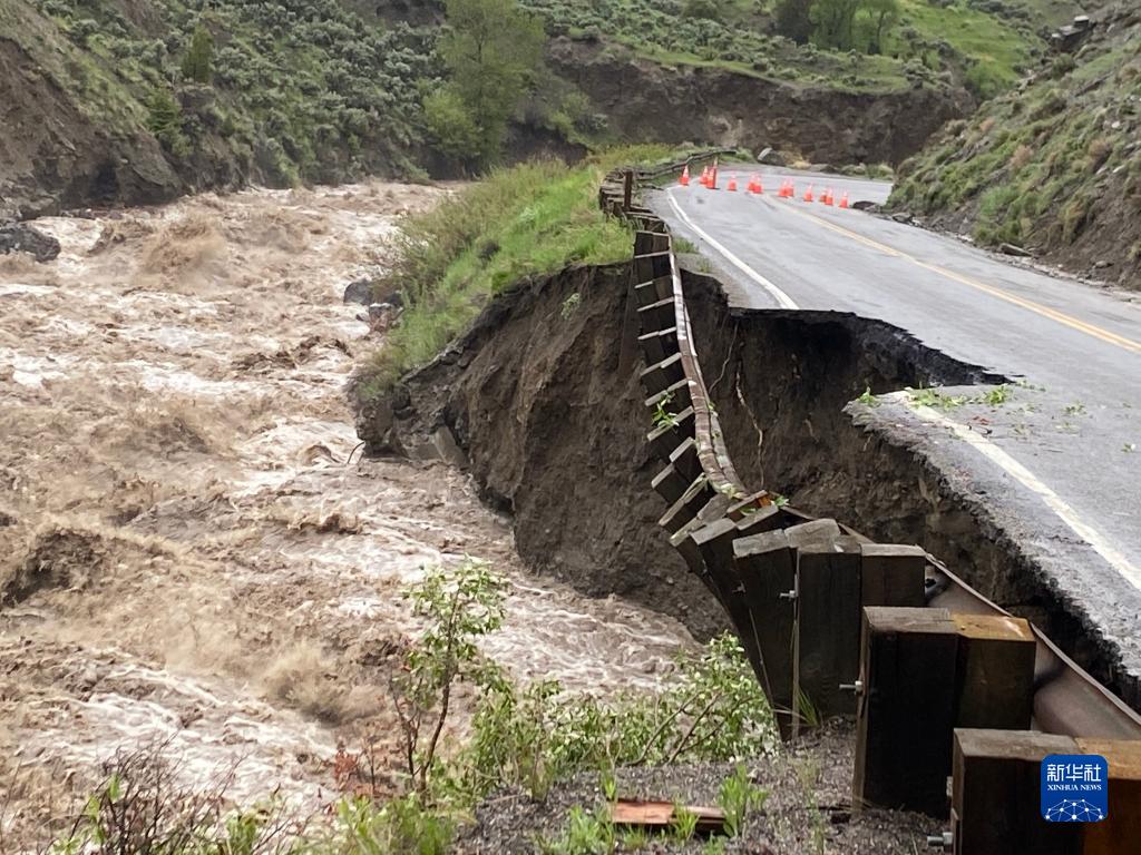 美国国家公园管理局6月13日发布的照片显示黄石国家公园北入口的洪水和受损道路。