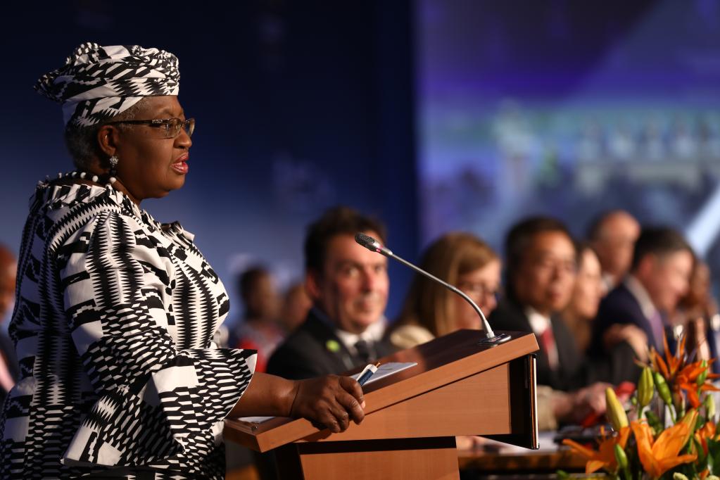 6月12日,世界贸易组织总干事伊维拉(前)在瑞士日内瓦举行的世贸组织第12届部长级会议开幕式上致辞。(新华社发,世界贸易组织供图)