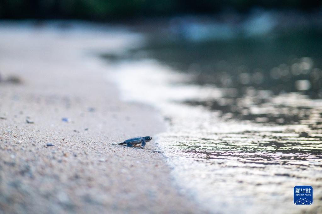 6月14日,在马来西亚丁加奴州热浪岛北部査加尔瑚棠海龟保护区,一只小海龟奔赴大海。