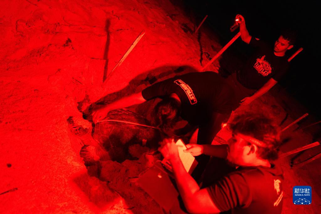 6月14日,在马来西亚丁加奴州热浪岛北部査加尔瑚棠海龟保护区,研究人员在测量一只绿海龟。
