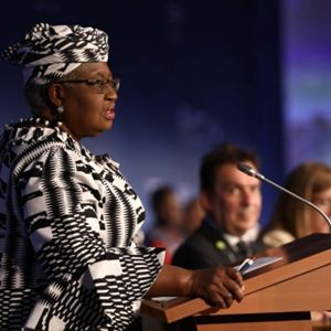 6月12日,世界贸易组织总干事伊维拉(前)在瑞士日内瓦举行的世贸组织第12届部长级会议开幕式上致辞。新华社发(世界贸易组织供图)