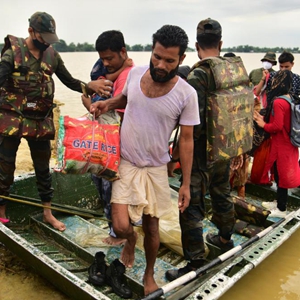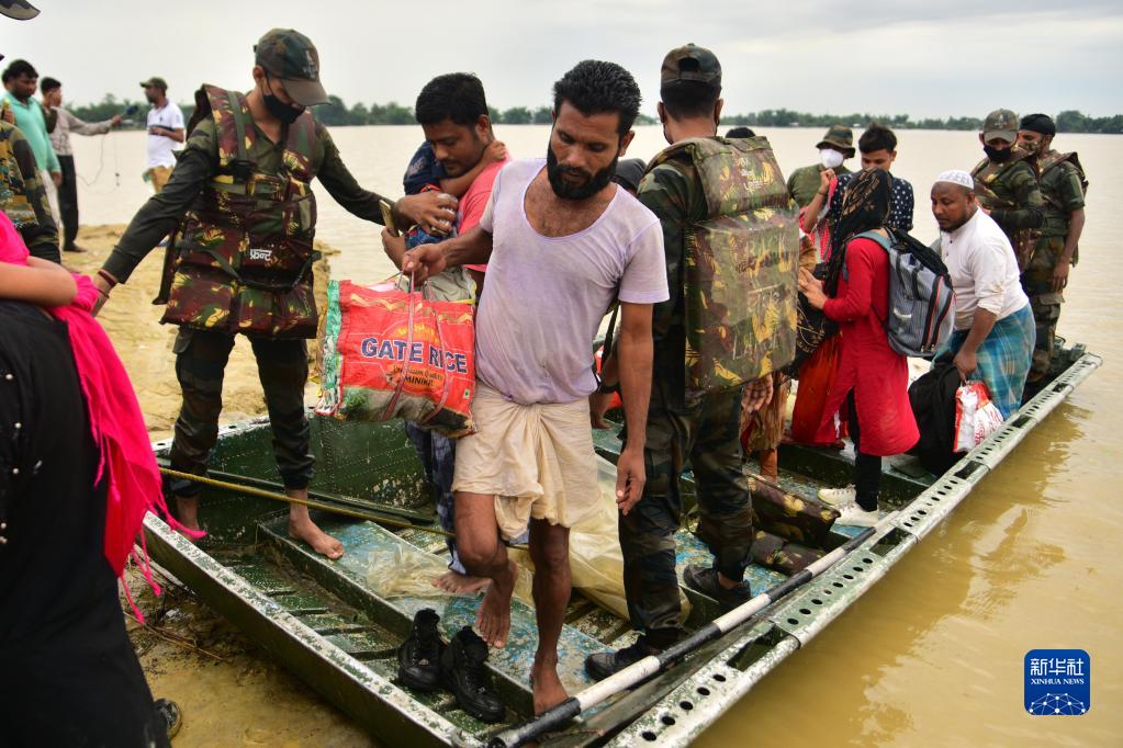 6月18日,在印度阿萨姆邦霍杰伊地区,受灾村民乘船抵达安全地带。