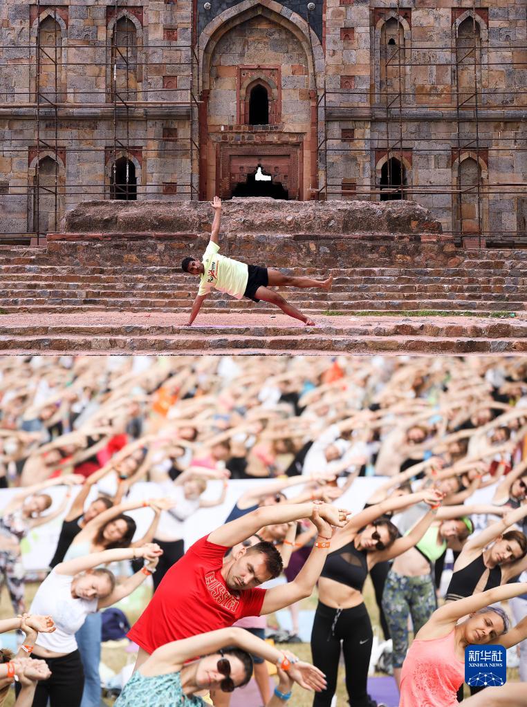 拼版照片:上图为2019年6月21日,一名男子在印度新德里练习瑜伽(新华社记者张迺杰摄);下图为2019年6月23日,人们在俄罗斯莫斯科练习瑜伽(马克西姆摄)。