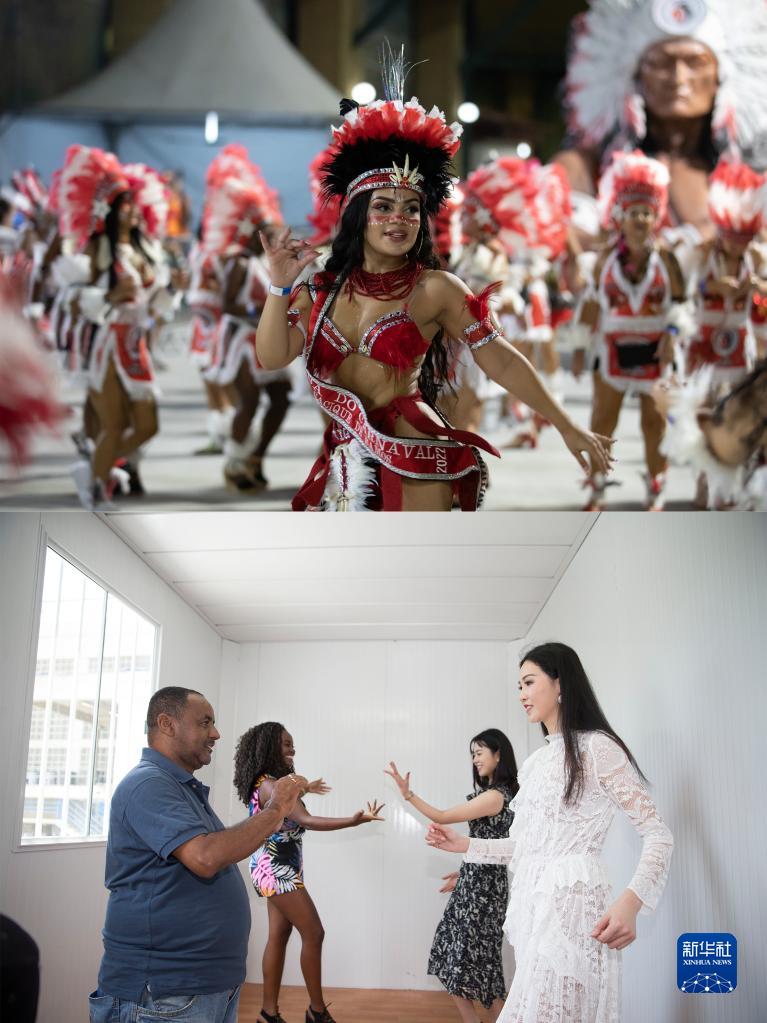 拼版照片:上图为2022年2月26日,表演者在巴西里约热内卢桑巴之城参加狂欢节假期庆祝活动(新华社记者王天聪摄);下图为2018年2月8日,两名来自中国的环球小姐李珍颖(右一)与贺婷婷(右二)在巴西里约热内卢学习桑巴舞(新华社记者李明摄)。