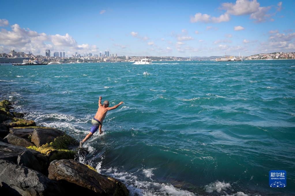 6月18日,一名男子跳入土耳其伊斯坦布尔的博斯普鲁斯海峡游泳消暑。