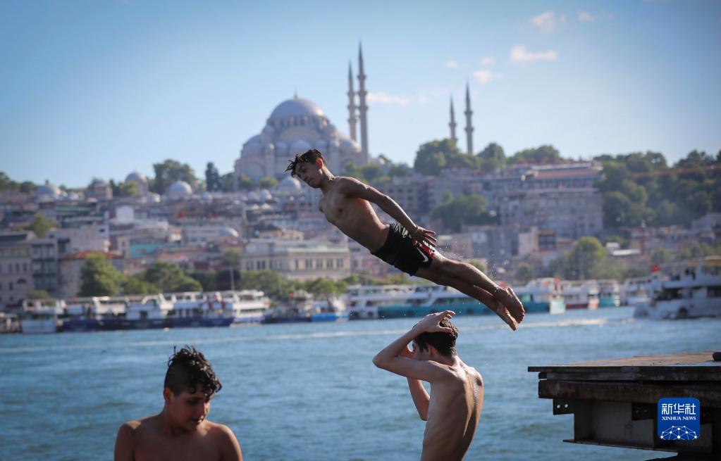 6月18日,一名男孩跳入土耳其伊斯坦布尔的博斯普鲁斯海峡游泳消暑。