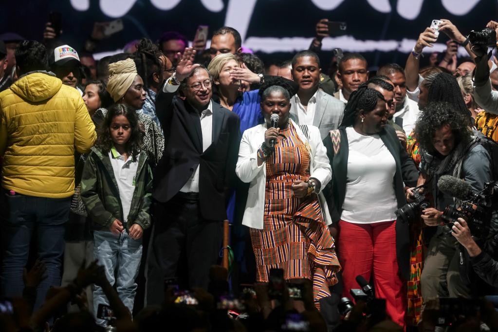6月19日,左翼竞选联盟“哥伦比亚历史公约联盟”候选人古斯塔沃·佩特罗与他的竞选搭档弗朗西亚·马尔克斯在哥伦比亚首都波哥大庆祝大选获胜。新华社发(帕斯摄)