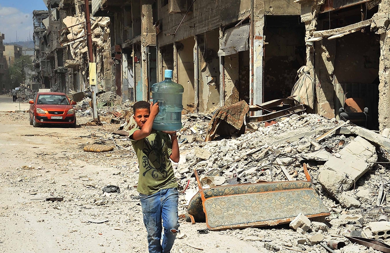 ↑2021年9月23日,在叙利亚首都大马士革城南的巴勒斯坦难民聚居区——耶尔穆克难民营,一名少年从建筑废墟旁走过。