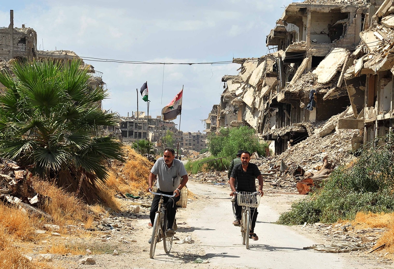 ↑2021年9月23日,在叙利亚首都大马士革城南的巴勒斯坦难民聚居区——耶尔穆克难民营,人们在废墟间骑行。