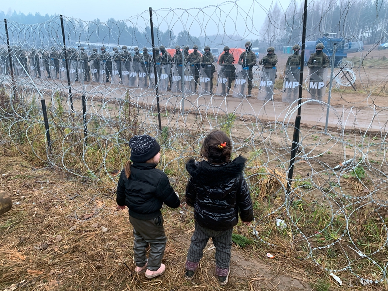 ↑2021年11月14日,在白俄罗斯靠近波兰边境的一处难民点,两名儿童透过边境线上的铁丝网遥望波兰一侧的军人。