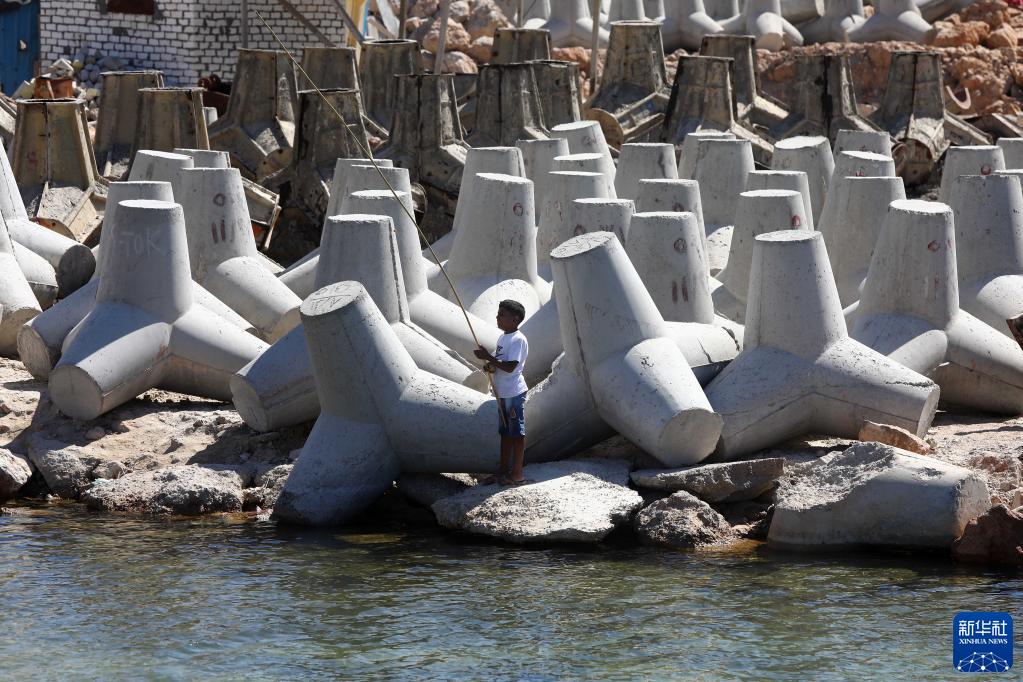 6月19日,在埃及亚历山大,一名男孩在一处放置了混凝土防浪构件的海边钓鱼。