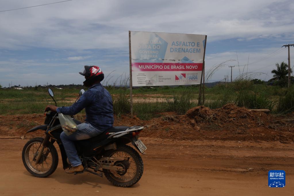5月19日,在巴西帕拉州巴西诺沃,一名骑摩托车的男子经过一处告示牌。该告示牌显示有金砖国家新开发银行和帕拉州政府字样。