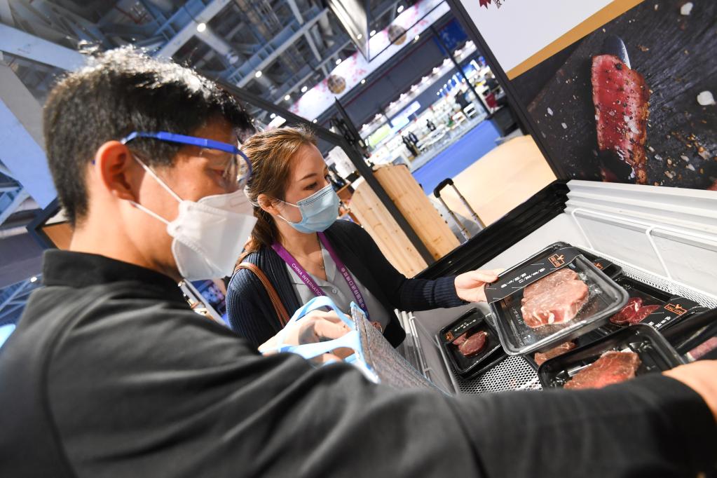 2020年11月7日,在第三届进博会食品及农产品展区绿地食品馆,工作人员(左)向参观者介绍南非牛肉。新华社记者陈晔华摄