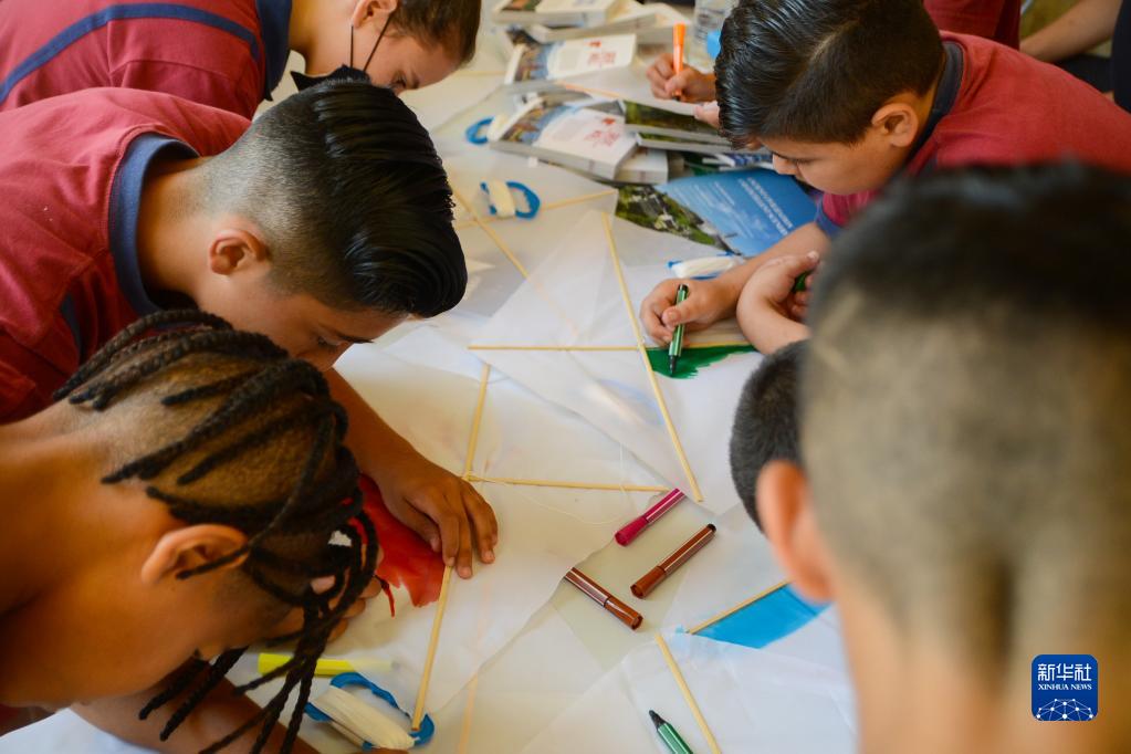 6月22日,在马耳他卡尔卡拉市,参加“中国风筝节”的学生制作风筝。