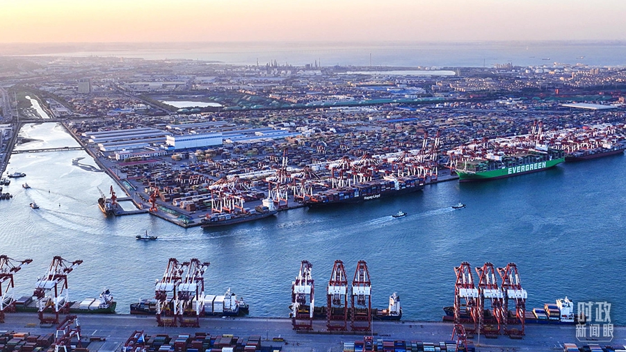 2022年5月,山东青岛港,前湾集装箱码头车船如织。(图/视觉中国)