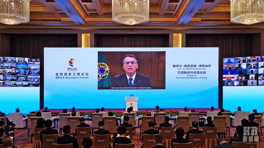时隔五年,中国再次作为主席国主办金砖会晤。今年金砖国家工商论坛以线上线下相结合的方式举行。金砖五国领导人齐聚当晚的论坛开幕式,南非总统拉马福萨、巴西总统博索纳罗、俄罗斯总统普京、印度总理莫迪也以视频方式出席并致辞。