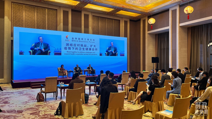 2022年金砖国家工商论坛还设置了5个专题研讨议题,这是主题为“团结应对挑战,扩大疫情下的卫生健康合作”专题研讨分会场。(总台央视记者陆泓宇拍摄)